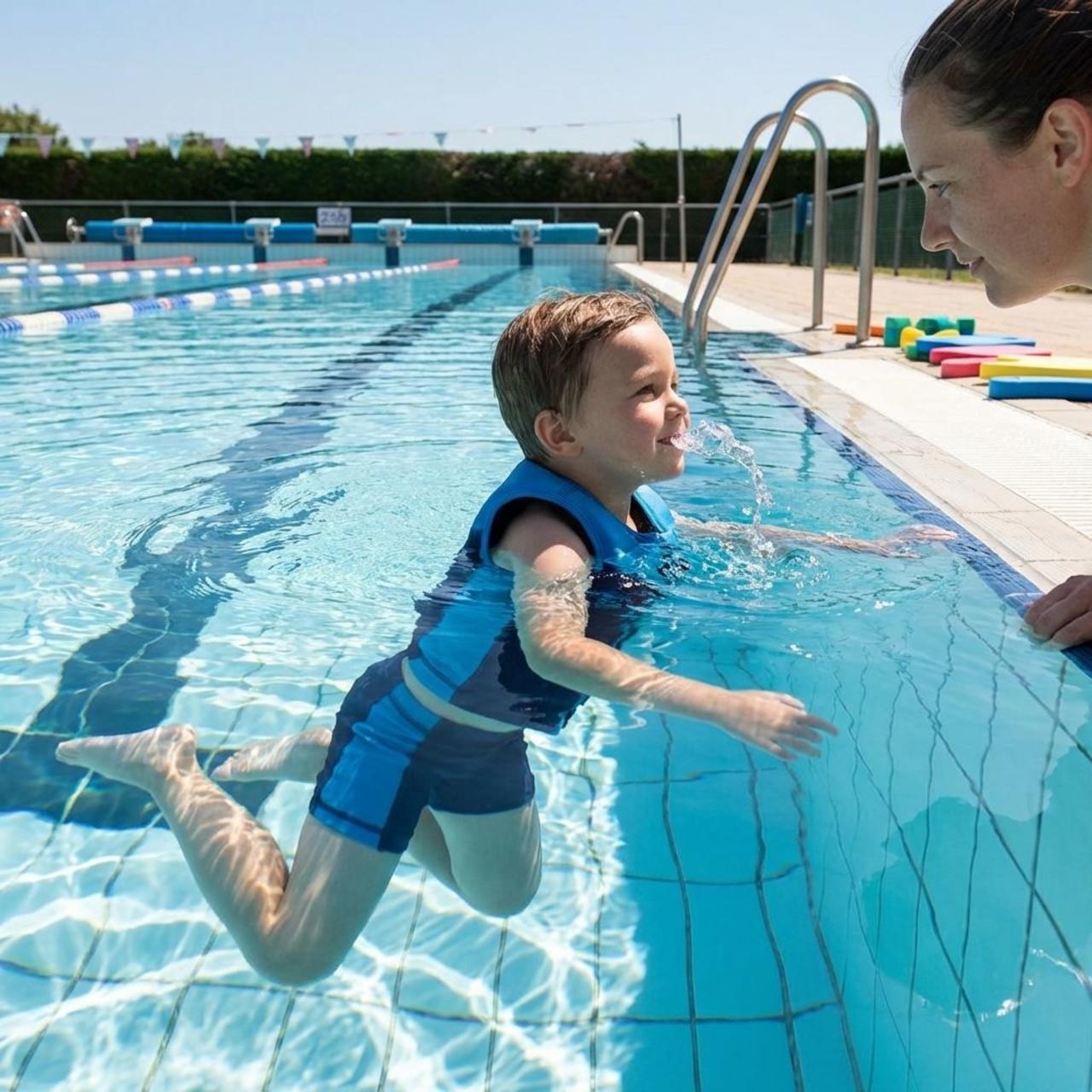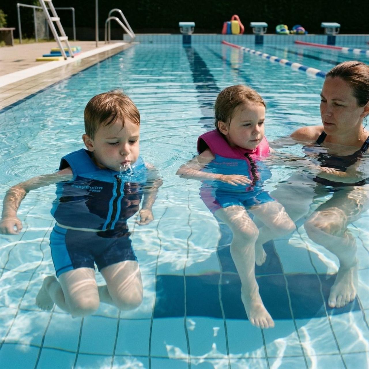 - Learning in deep water with a floating suit helps children move naturally while staying safe.