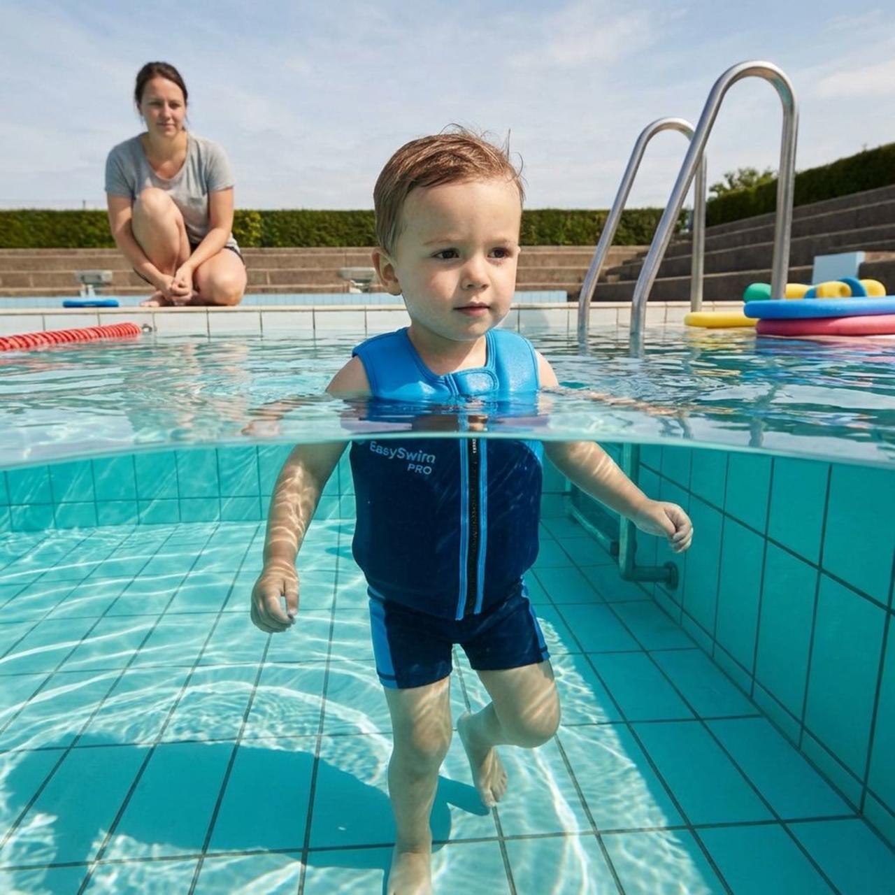 Our floating suits are specially designed as learning aids, not as flotation vests or life jackets. They provide all-around support while letting children move their arms, legs, and bodies as freely as possible. In deep water, a child wearing a floating suit can experiment with rolling, gliding, and floating, all while feeling secure. This means they are never forced into a single position or held up artificially. Instead, they build a real understanding of how their body behaves in the water. Parents watching from the side often see their child’s face light up as they learn to float on their own for the first time.